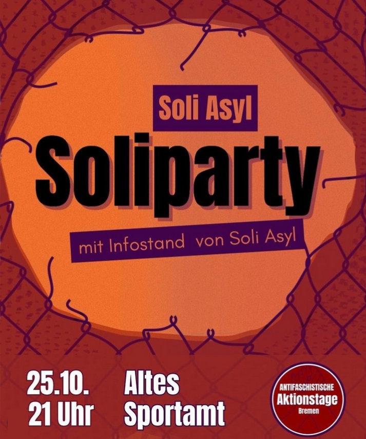 Am 25. Oktober wollen wir kurz vor der Winter-Pause noch einmal im alten Sportamt Bremen die Tanzfläche erobern! Mit guter Musik und leckeren Getränken feiern wir die Solidarität – denn die Einnahmen gehen an Soli-Asyl Bremen. Es wird auch einen Info-Stand geben, also packt eure Kommiliton*innen und Friends ein, kommt vorbei und lasst uns zusammen einen unvergesslichen Abend haben!